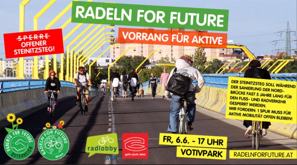Am 6. Juni 2025 demonstrieren viele #WirMachenWien Initiativen bei Radeln for Future für einen offenen Steinitzsteg