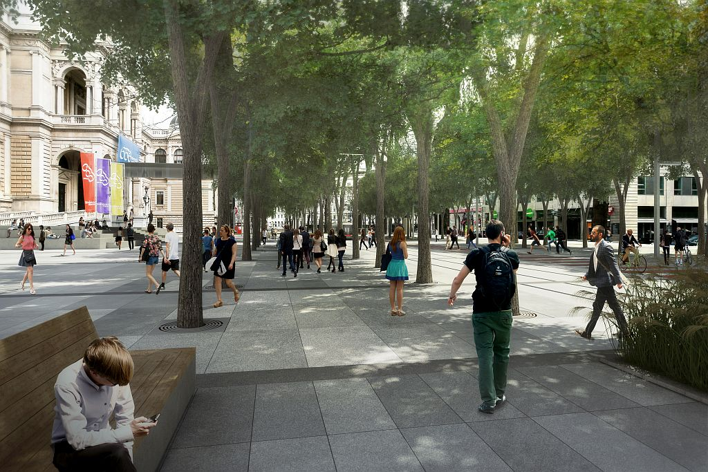 Ideen für eine autofreie Umgestaltung am Ring gibt es schon genüge – wie hier vom Stadtplanungsbüro Barcelona Regional im Auftrag der Stadt Wien bereits 2015 erarbeitet (Rendering: Barcelona Regional)