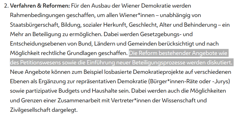 Wann und wodurch diese Zielvorstellung durch den Gemeinderat hergestellt wird? Wie die Verbindlichkeit von Empfehlungen des Bürger:innen-Rates hergestellt werden soll? Das bleibt offen. Wir sind jedenfalls schon jetzt bereit für eine Reform des Petitionswesens! Dafür haben wir ja unsere “Evaluation der Empfehlungen des Petitionsausschusses 2021-2024” vorbereitet, die wir bald publizieren werden.