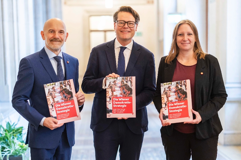 Im Rathaus zeigen Gemeinderat Thomas Weber, Demokratiestadtrat Jürgen Czernohorszky und Gemeinderätin Nina Abrahamczik die soeben beschlossene Strategie. (Foto Stadt Wien / Bubu Dujmic)
