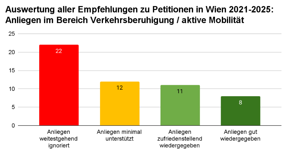 Wie werden Petitionen an den Wiener Gemeinderat vom Petitionsausschuss behandelt? Nach einer langjährigen Reihe von Enttäuschungen über mangelnde Unterstützung der Petitionsanliegen in den Empfehlungen des Ausschusses haben wir eine Evaluation von Verkehrswende-Petitionen der Jahre 2021-2025 vorgenommen. Das Ergebnis: nur acht von 53 Petitionsempfehlungen geben das Anliegen der Einreicher:innen gut wieder. Wir haben den Grund dafür eruiert.