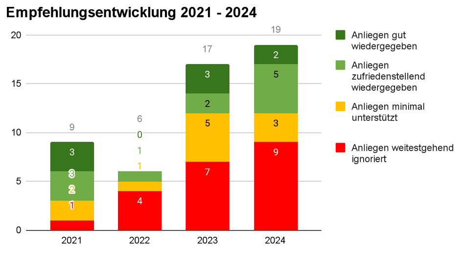 Alle Petitionen und die 53 Bewertungen sind in unserem Bericht (download hier) aufgelistet. Die Entwicklung der Jahre 2021-2024 zeigt, dass sich immer mehr Bürger:innen in Petitionen zu klimagerechtem Verkehr und öffentlichem Raum an den Gemeinderat wenden – aber der Anteil der guten Empfehlungen weiter sinkt.