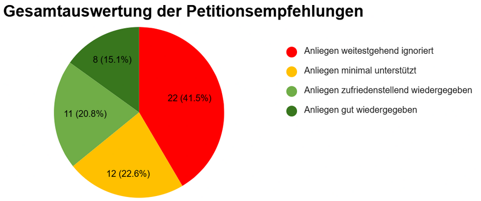 Als Ergebnis zeigt sich eine eklatante Diskrepanz zwischen den Wünschen der Petitionen und den Empfehlungen des Ausschusses. 63% der Empfehlungen gaben das Anliegen schlecht oder minimal wieder, nur 15% haben das Petitionsanliegen gut abgebildet.