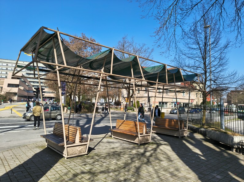 Ein Beispiel dafür ist das „Climate Shelter“: ein Schattenspender und Aufenthaltsort direkt vor dem Krankenhaus in Ljubljana – umgesetzt anstelle von VIP-Parkplätzen.