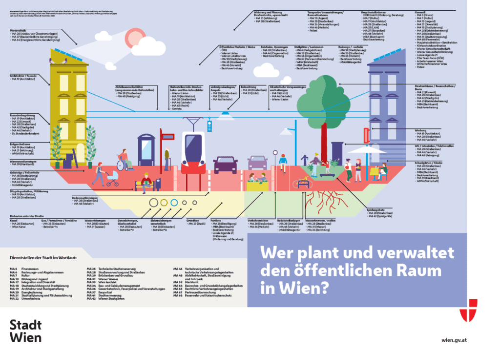 Die Abteilung Architektur und Stadtgestaltung der Stadt Wien hat eine Grafik veröffentlicht, die etwas Licht in die Sache bringt. Im Straßenquerschnitt werden die zuständigen Stellen für jedes potenzielle Element erläutert, seien es Bodenmarkierungen, Fassadenbegrünung, Wasserbrunnen, oder auch weniger offensichtliche Fragen der Infrastruktur wie etwa Glasfaserkabel oder Abfallsammelbehälter.